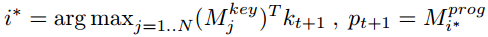 NPI 的推理过程如下(详见论文 Reed & de Freitas (2016) 第 3.1 节和算法 1)。在时间步 t 上,编码器 f_enc 接收环境观测量 e_t 和参数 a_t,输出状态 s_t。核心 LSTM 网络 f_lstm 接收状态 s_t、程序嵌入向量 p_t∈ R^P 和上一个隐状态 h_t-1,从而更新自身的隐状态 h_t。根据最顶层 LSTM 的隐状态,多个解码器可产生如下输出:返回概率 r_t、下一个程序的键嵌入向量 k_t+1,以及下一个程序的参数 a_t+1。通过对比键嵌入向量 k_t+1 与键存储器 M_key 中的每一行,可得到下一个程序的 ID。于是,从存储了 N 个程序的程序存储器 M_prog 中可以获取下一个程序的嵌入向量: