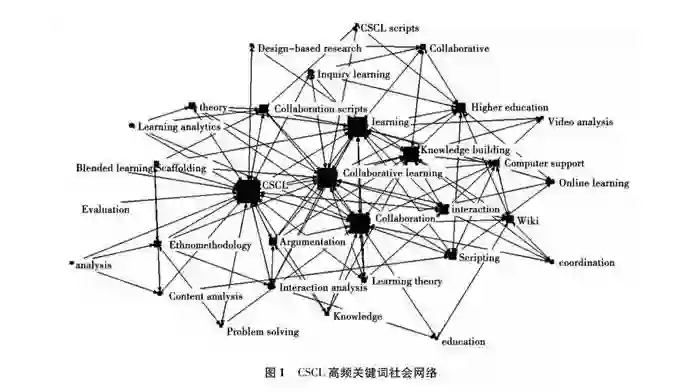 高频关键词的社会网络图展现了计算机支持的协作学习主题分布状态,以CSCL为主要研究内容,环绕呈现出了知识建构、协作学习策略、协作学习工具、学习模式以及协作学习分析等主题。