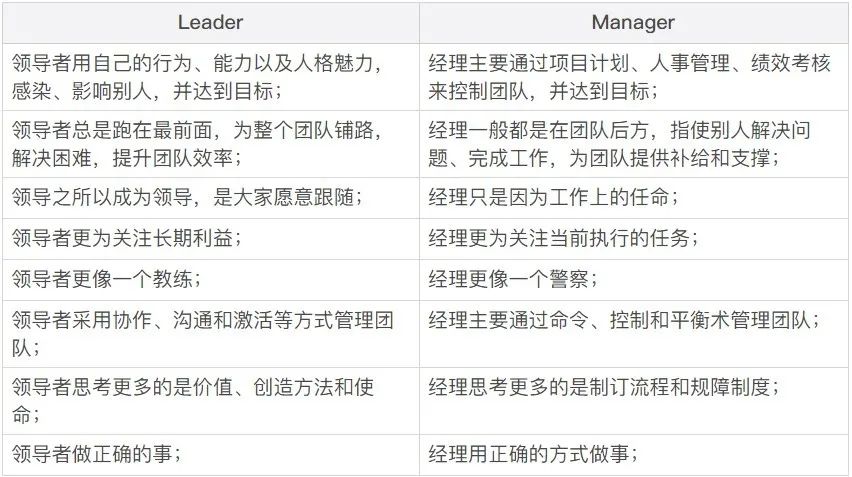网上可以找一个 Leader vs Manager 的图(如下图),Leader 身先士卒,而经理则更像一个奴隶主或官员。
