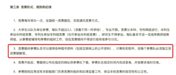 「竞赛期间参赛队员可以使用各种图书资料(包括互联网上的公开资料)、计算机和软件」。
