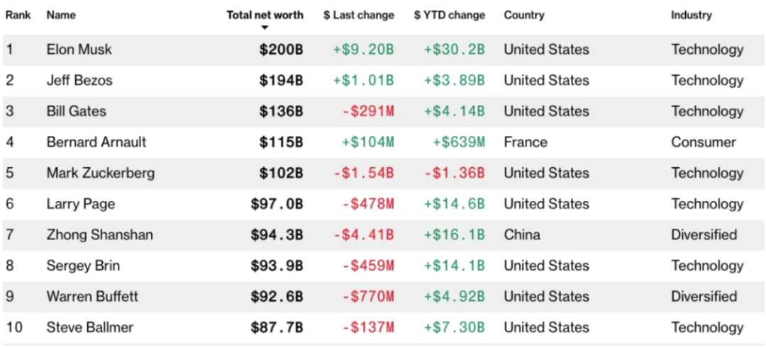 【身价2000亿美元,马斯克重新登顶世界首富】据彭博亿万富翁指数显示,特斯拉CEO马斯克重新成为世界首富,其资产达到2000亿美元;此前,有媒体报道称,马斯克旗下SpaceX完成新一轮融资,从红杉资本牵头的投资者手中融资8.5亿美元,SpaceX在此轮融资中估值为740亿美元,较8月份增长了60%,使得马斯克净资产增加了约110亿美元。