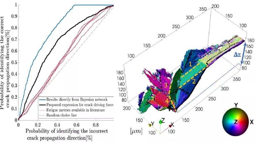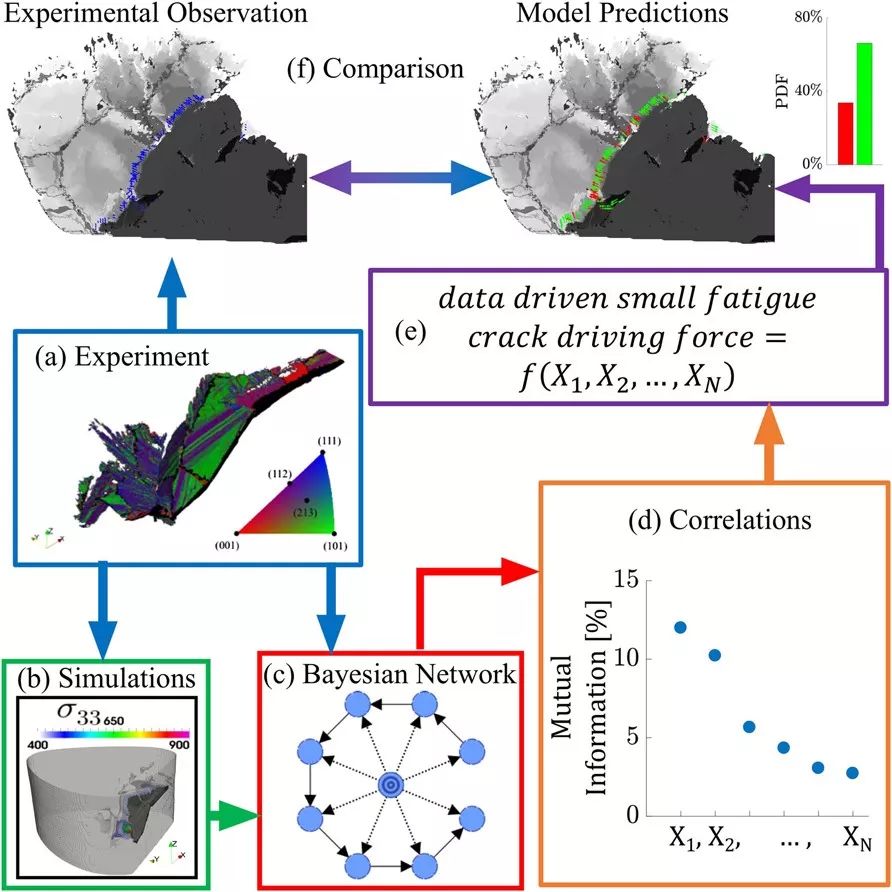 由美国普渡大学Michael Sangid领导的团队,提出了一种识别微结构小疲劳裂纹驱动力的新方法。他们采用机器学习建立了两个独立的贝叶斯网络,分析了钛合金原位疲劳循环过程中获得的衍射数据和X线断层影像数据。该方法能识别影响疲劳裂纹扩展方向和扩展速率的微机械和微结构变量。他们发现,第一主应力轴在特定方向上的取向和最大分辨剪切应力与裂纹扩展最为相关,将其纳入关系分析中可以描述裂纹扩展方向的概率。他们的分析模型可靠地预测了小裂纹扩展的方向,再现了实验结果,比之前文献的预测更为可靠。这种半监督机器学习方法不仅可以识别钛合金中小裂纹扩展方向背后的复杂变量,也有望识别其他复杂工程问题中的驱动力。