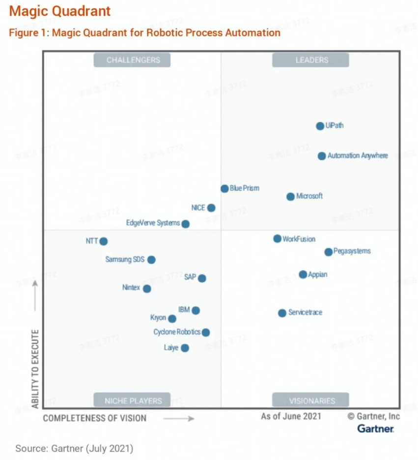 Gartner 近期调研数据显示,全球约有近100家RPA供应商,其中活跃的商业化产品厂商约有50-60家,而最后入围Gartner 魔力象限全球报告的只有15家。
