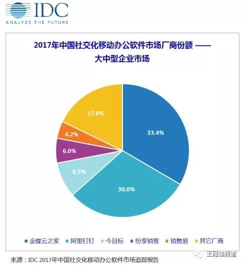 而且就在今天(4月3号),IDC发布了《2017 China Social Mobile-office Software Market Tracker》(《2017中国社交化移动办公市场报告》)。数据显示,2017年在大中型企业市场,金蝶云之家以33.4%领跑行业。至此,金蝶云之家已经连续三年占据市场份额首位。