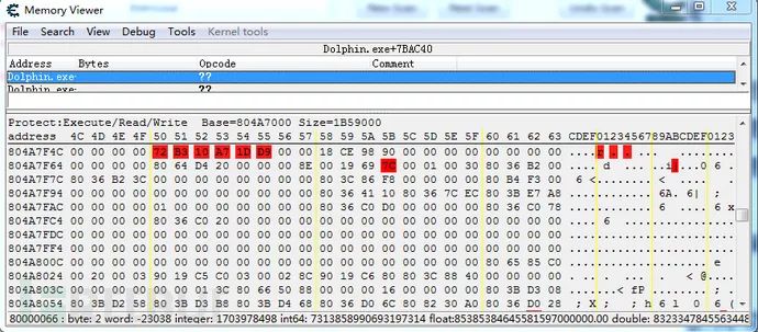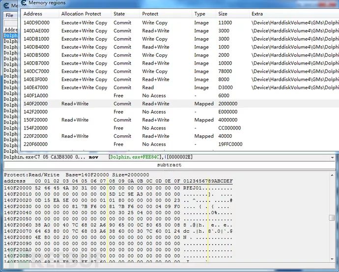 旧版的32位dolphin申请的模拟器地址基本是在7FFFFFFF-80000000区间,而新版取消了以往的直接申请模式,地址随机变化,因此我们首先第一步就是要把游戏的模拟内存找到,这样便于动静态分析。目前网上没有一个统一的办法可以直接找到,这里我通过多次尝试找到一个比较稳定的查找映射内存地址的办法,就是用CE的内存区域查看,寻找dolphin.exe的内存结束地址,往下的第一个大小为0x2000000的MAPEPED内存地址就是目标内存地址。