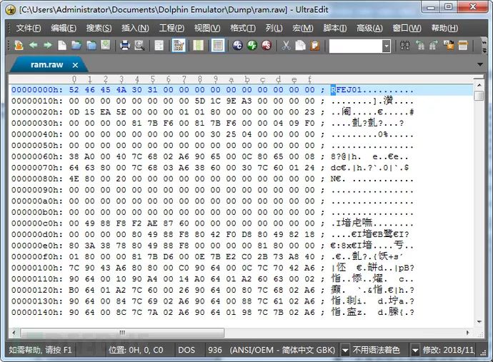 DOLPHIN在载入游戏镜像后,会申请一块内存用于模拟游戏内存,此内存有游戏的主要代码,其地址在每次游戏启动的时候随机申请,然后通过模拟机制模拟WII的系统运行,游戏内存运行的地址通过dolphin调试模式可以看到其模拟的地址始终从0x80000000开始。可以通过模拟器调试模式的内存->转储主内存把当前的主要内存保存为文件,位置在:C:\Users\你的账户名\Documents\Dolphin Emulator\Dump\ram.raw