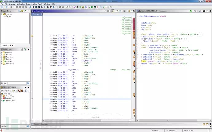 其中为实现自动化分析,需要将乱数计算的算法逆向,可以使用GHIDRA辅助理解。这是80084de8的POWERPC代码以及伪代码。