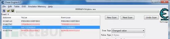 下面就开始查找这个随机数的地址。这里我们利用CE的变化值和非变化值的监控来达到目的,首先使用CE监控dolphin进程,并按照上述方法将ROM内存找到并重定位,利用未知初始值->变化的值->不变的值->变化的值…反复查找,最后找到有如下地址是可疑的