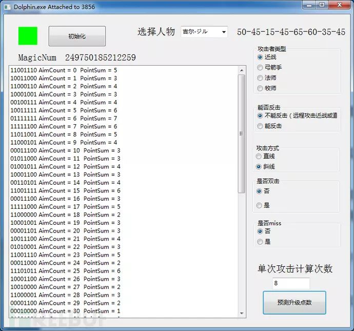 理想中的完全自动化是直接HOOK Dolphin的OPENGL显示,动态显示当前的乱数值,以及根据当前选择的人物瞄准攻击的目标,然后自动计算出改变乱数循环多少次升级属性的点数,由于对Dolphin代码研究不多加上自己懒,就只通过CE的Trainer实现了一个简化版的,通过确定此次攻击之后某个人物要升级,工具预测乱数值循环次数对升级属性的影响。