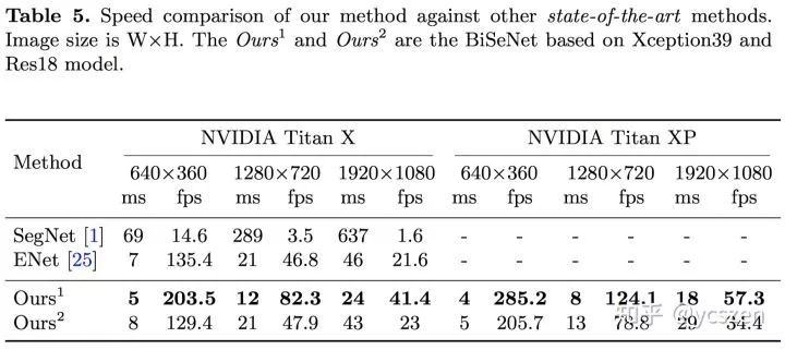文中还给出了BiSeNet的GFLOPS、参数量等信息,以及在不同硬件平台不同分辨率下的速度对比。