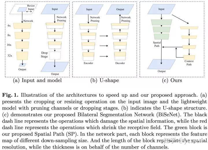 这些提速的方法会丢失很多Spatial Details或者牺牲Spatial Capacity,从而导致精度大幅下降。为了弥补空间信息的丢失,有些算法会采用U-shape的方式恢复空间信息。但是,U-shape会降低速度,同时很多丢失的信息并不能简单地通过融合浅层特征来恢复,如图10(b)所示。