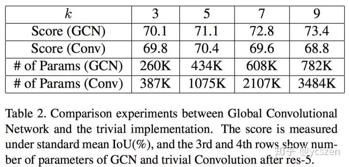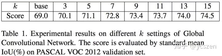 可以看到GCN依然优于普通Conv的堆叠,尤其是在较大Kernel Size的情况下。笔者认为这是一个很有价值的实验,可以启发我们去思考关于网络感受野的问题。我们以往认为,通过堆叠多个小核Conv可以达到和大核Conv一样的感受野,同时计算量还更少。最常见的应用比如VGG-Net。但是,实际上并非如此。