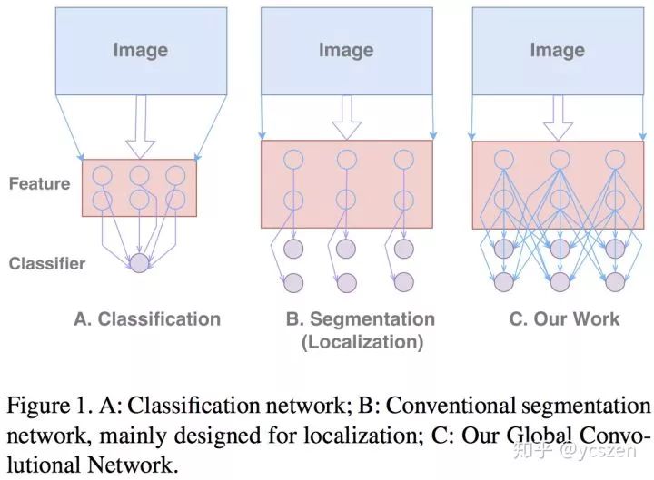 GCN主要将Semantic Segmentation分解为:Classification和Localization两个问题。但是,这两个任务本质对特征的需求是矛盾的,Classification需要特征对多种Transformation具有不变性,而 Localization需要对Transformation比较敏感。但是,普通的Segmentation Model大多针对Localization Issue设计,正如图2(b)所示,而这不利于Classification。