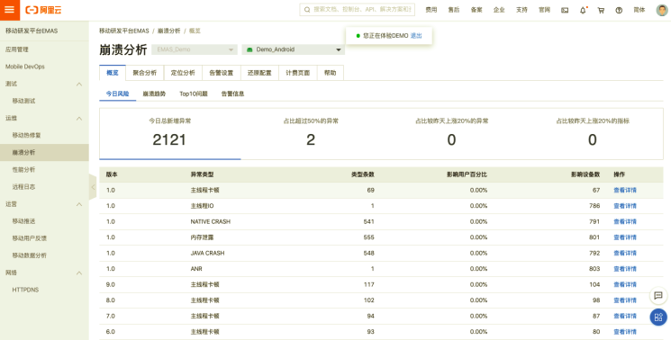 基于“EMAS端到端解决方案DP2”的秒级数据处理能力,高可用监控实现实时智能告警,从端上数据采集到产出报表,打通整条数据链路,让移动端高可用数据触手可得。崩溃分析提供双端Crash监控、聚合查看、Crash原因定位、告警配置等服务。