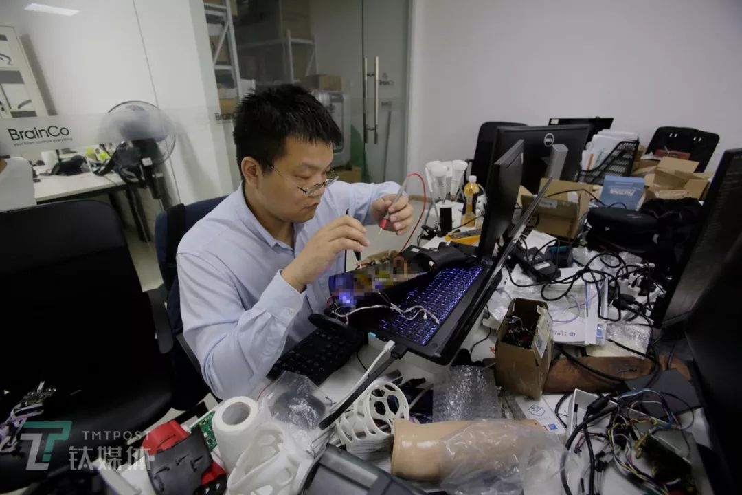 2019年4月24日,深圳高新区,脑机接口技术公司BrainCo办公室,智能灵巧假肢项目BrainRobotics中国区算法负责人、量产负责人黄琦在修理一只用于展示的肌电假手。