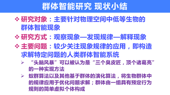 新一代人工智能把群体智能当成人工智能,而我们需要提出新的认识,群体智能本身是自然智能。科学家认识群体智能机理,我们还希望能够把这种规律或者机理利用起来。