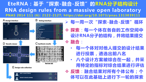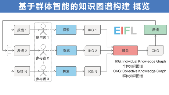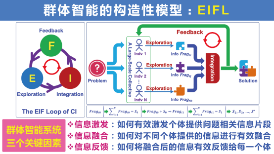 群体智能的构造性模型EIFL,由三个环进行信息激发、融合和反馈。个体探索之后形成片段,融合之后反馈回来,通过多轮迭代形成一个解决方案。