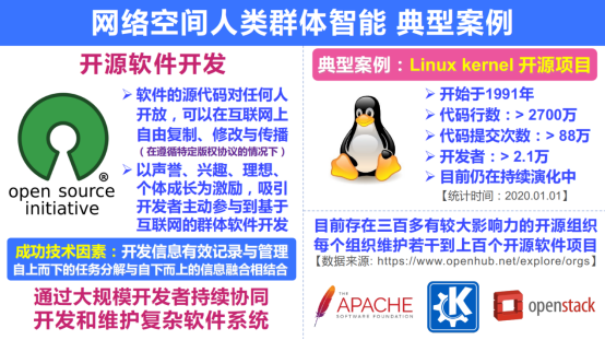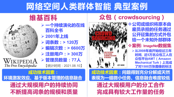 互联网的出现为人类群体的跨时空大规模协同提供了可能,网络空间中的人群不再受到地域和时间的限制,更大规模的人类群体可以在网络空间中进行更加方便灵活的显式或隐式交互。互联网技术的不断发展,促进了网络空间人类群体智能系统的探索和成功实践。