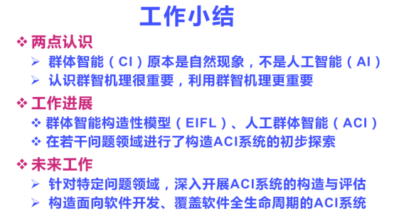 通过群体智能构造性模型,在求解特定问题的时,个体探索之后,用机器汇聚效率高,还需要确保正确性。目前,我们在软件工程领域开展了初步的探索,取得了一定效果。希望未来,对开源社区的平台机制提供一些帮助,实现自动汇聚。以百科平台为例,是由人来管理,我们有没有更好的办法合作?类似这样的系统有没有更好的办法引入机器的能力?现在,实际上是想把AI用到群体智能系统的构建,用AI去加强融合和反馈,替代人的工作。我们最关心的是在软件开发中,能不能更多的人去参与,AI在软件开发中的应用,以及AI在群体化软件开发中应用。谢谢大家。