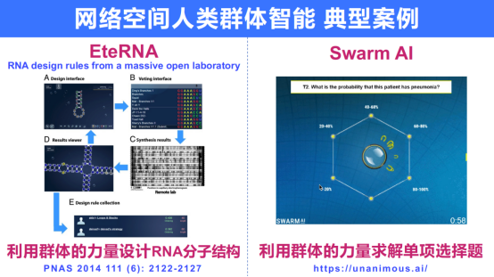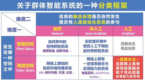 与物理空间群智机理探索的研究工作缺少结合:网络空间关注利用“群智”“群力”的实践;物理空间关注低等生物群智现象的观察解释;鲜有结合二者的努力。