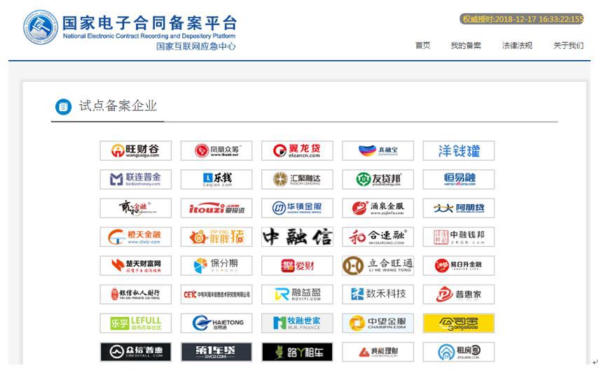 官网信息显示,国家电子合同备案平台由一站式电子合同服务平台“和签”负责具体运营及相关业务,并与深圳国际仲裁院、中国广州仲裁委员等仲裁机构建立了合作伙伴关系,可以为出借人提供便捷的司法服务支持。截止目前,试点备案的机构已有42家,且以互金平台为主,保全合同近千万份。