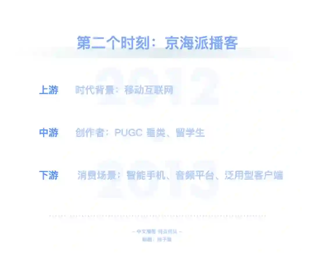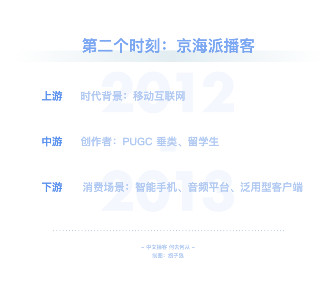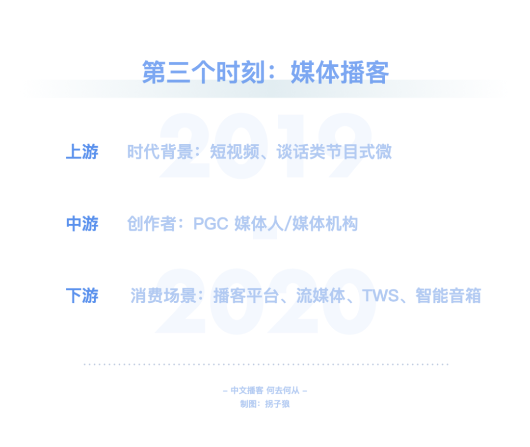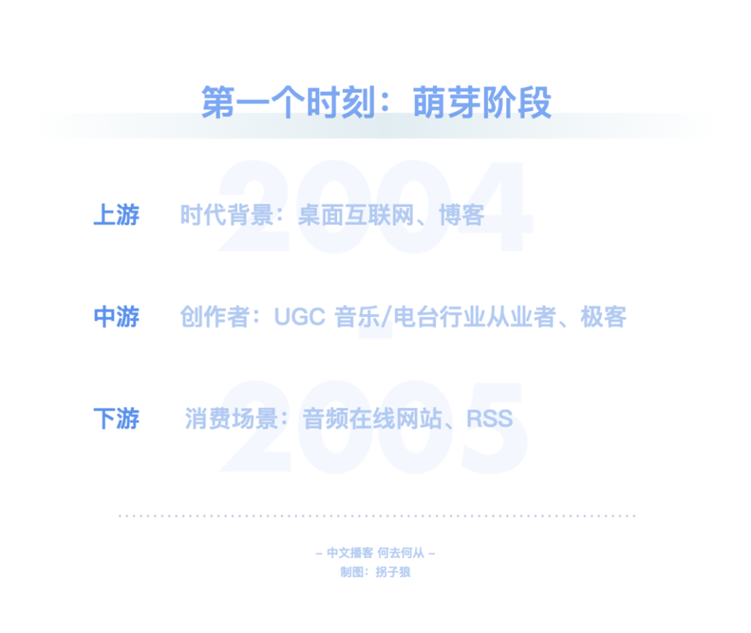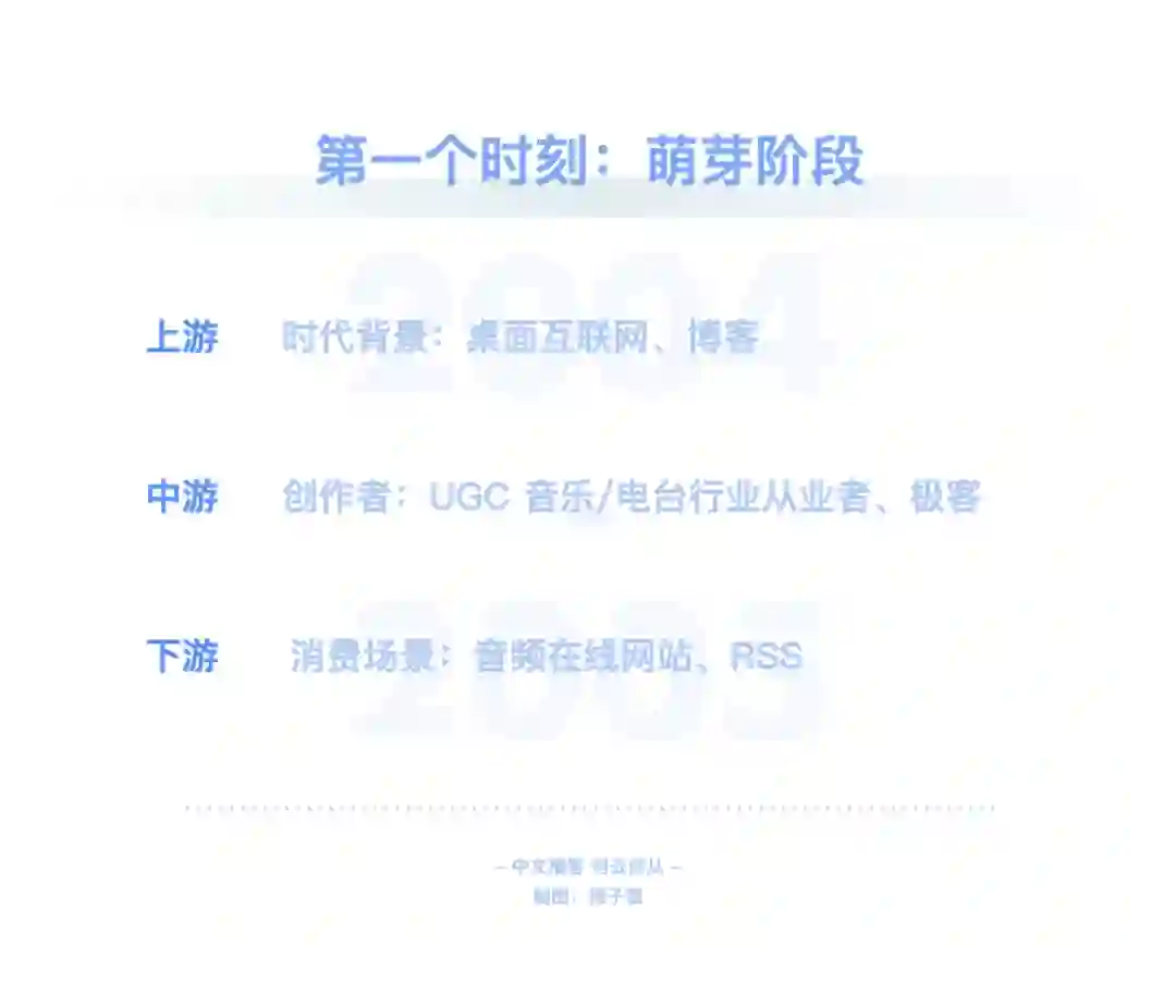 在文章伊始就已提及,RSS 技术已经衰微,泛用型播客客户端注定小众。而喜马拉雅、荔枝等第一代音频平台在播客领域的投入与产出完全不成正比。平台不能赚钱,有时比创作者用爱发电更要命。小宇宙等新一代平台也面对着一样的问题。如何破局?其实同作为内容平台,播客的一切问题都可以对照视频来看。在视频产业里,以 PGC、PUGC 和 UGC 三种类型来区分,则可分别对应长视频、中视频和短视频,其对应的平台则是 Netflix、Youtube / B 站、抖音 / 快手。中文播客以谈话类长内容为主,那对标的就是 Netflix、Amazon、Disney+、Hulu、Apple TV+ 等,即内容采买、付费订阅。Spotify 走的也是相似之路。独家内容带来的好处自不必说。「剩余价值」停更后,「随机波动」一段时间内只在小宇宙更新,使其至今仍是小宇宙订阅量最高的节目。但目前小宇宙的体量还不足以使其走上奈飞模式。这有点像早期的微信公众号、百家号、头条号之间的争夺战。用户去哪里,哪里才有垄断内容的可能性。一方面,对话体的长内容打磨不够精细,复听率不高,奈飞模式也许更适合看理想等知识付费平台。另一方面,体量不够大的前提下,也没有资金采购内容。那么走 Youtube / B 站的中视频形式更加契合。很多播客虽然时长不短,却不足以真正称之为长内容,和电影、电视剧等同样长度的内容比起来,它们并不能给消费者多大的付费动力,也不那么具备娱乐属性。绝大部分的时长被花费在建立语境这件事情上,信息密度不是很高。所以,从内容形态上来看,还是将长播客与中视频并列对比更合适些。而即便以 Youtube / B 站为目标看待小宇宙等平台的未来发展方向,也是有些吃力的。因为这些 PUGC 平台的内容丰富,类目众多,而中文播客的种类太少。B 站以二次元起家,形成了鬼畜等自有文化,播客领域却没有这些二创文化。同样,Youtube / B 站可以找到各类教程视频,播客领域这方面什么都没有。哪怕是教人做播客的内容,绝大部分还是以图文或视频方式呈现。当下的中文播客里,媒体属性,尤其是谈话类为主的媒体属性太过强烈,PUGC 创作者难以找到适合自己的节目形式,就像文章第一章中提到的「影视飓风」「管泽元」的例子,同样是播客还不如编辑为视频后收获的关注量大。如何在照顾好 PGC 播客厂牌们的同时为 PUGC 创作者提供更好的创作环境,也是平台必须要考虑的事情。在这方面,即便还不存在短播客市场,仍可以向短视频平台学习经验。从抖音和快手的崛起上就可以嗅探到机会:抖音最早以音乐为主打,快手则由 GIF 创作工具衍生而来。音乐和工具,是成熟且长久的需求。就像书迷会乐于对比同一本书在不同版次间的区别那样,许多乐迷也对心仪乐队或歌手不同版本的歌曲津津乐道。这就有了一项很不错的短音频切入点:乐曲 demo。爱逛美术馆的人知道,一幅留名美术史的绘画创作,往往是在数十次草稿的修改后才能得出的。而人们知晓最终作品的存在,却很可能无视那些挥洒汗水的准备工作。不过对于爱好者而言,那些旷世名画的最早批次版本,依然存有不可比拟的创意和艺术性。近期周杰伦《最伟大的作品》热度霸榜,有许多人觉得不如过去的歌好听。其实这主要是和乐曲缺乏共鸣的原因,回忆之所以可以加分,是因为时间带来的陪伴感,而新歌是纯粹的陌生人。倘若周董能实时更新进度,每隔几周放出一支 demo,那既可以加强粉丝与新歌之间的联系,又能够使听众更加了解歌曲的创作思路,可能就不会有那么多听不懂之类的评价了。工具属性的短音频则更好理解,比如冥想和助眠使用的白噪音。市面上的许多白噪音软件都提供订阅服务,倘若这类音频被打包进前文所述的类奈飞的订阅模式,变成为平台维护、定时更新的常驻功能,自然很是契合,都是耳朵时间的一部分。Moon FM 的开发者高登近期就开发了一款白噪音 app Noise Smith;喜马拉雅也有类似的白噪音功能。此外,小红书也是一个很好的参照物。小红书的笔记文化是其社区的核心,图+文的形式比视频更低创作门槛,也可以非常全面地讲述一项教程或知识类的分享。目前的播客以音频替代文字,承载的多是文本内容;倘若代入到小红书的笔记载体里去,变成图 + 音频的形式,可以成就一种新型的播客笔记。纯粹的音频无法像视频那样,讲述一道菜的做法、一件手艺活的细节等,但图片 + 音频的形式可以。这也是一个很有特色的短播客平台方向。▍总结:中文播客,何去何从?回顾了中文播客的整个发展历程后,我的观点整理如下:中文播客目前历经了三个阶段,分别是萌芽阶段、京海派播客阶段和媒体播客阶段。萌芽阶段(2004-2005)的特点:桌面互联网时代;主流创作者来自音乐、电台行业;正值 RSS 的兴盛时期,依托网站进行分发;听众多使用 MP3、iPod 等载体收听节目。京海派阶段(2012-2013)的特点:移动互联网时代;京派传承自萌芽时期的北方播客,海派源自于留学生的回国热潮,两派播客的区别,一言以蔽之,京派播客给听众的听感为「这人不错」,海派播客给听众的听感为「这话很对」;出现了更多垂直品类的创作者,UGC 升级至 PUGC;RSS 技术衰落,但在播客领域仍有活力,Podcast、喜马拉雅、荔枝、蜻蜓等网络音频平台相继出现;听众多使用手机收听节目。媒体阶段(2019-2020)的特点:短视频时代;主流创作者多有媒体行业背景,为行业带来 PGC 的生产方式;RSS 技术在播客