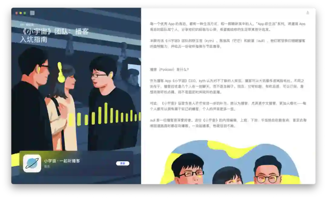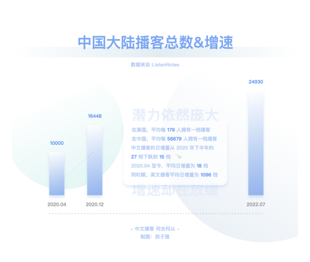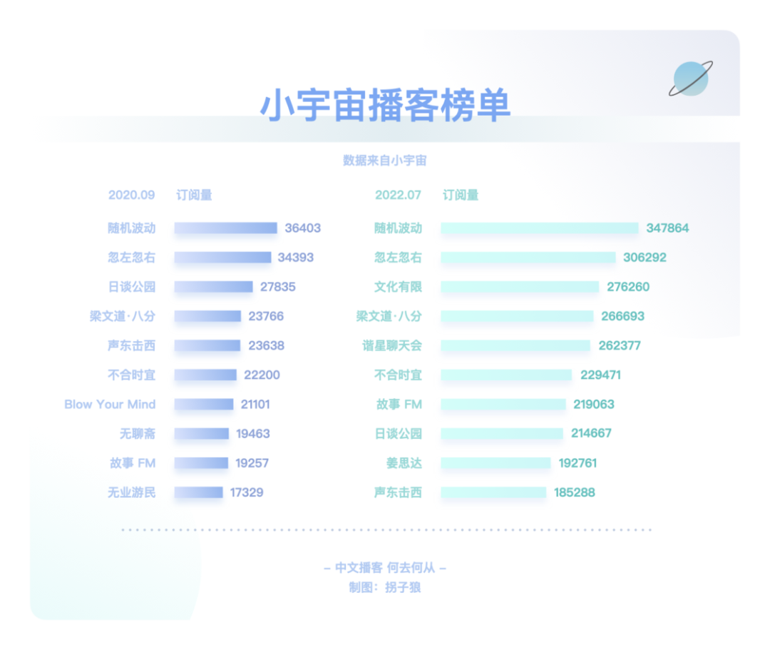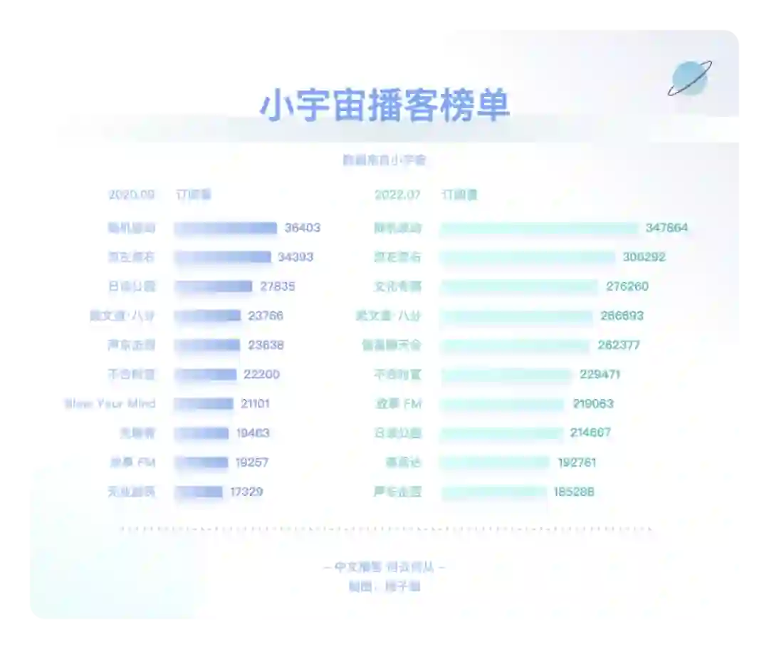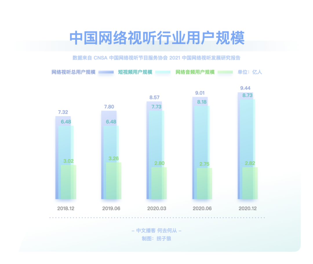 在文章伊始就已提及,RSS 技术已经衰微,泛用型播客客户端注定小众。而喜马拉雅、荔枝等第一代音频平台在播客领域的投入与产出完全不成正比。平台不能赚钱,有时比创作者用爱发电更要命。小宇宙等新一代平台也面对着一样的问题。如何破局?其实同作为内容平台,播客的一切问题都可以对照视频来看。在视频产业里,以 PGC、PUGC 和 UGC 三种类型来区分,则可分别对应长视频、中视频和短视频,其对应的平台则是 Netflix、Youtube / B 站、抖音 / 快手。中文播客以谈话类长内容为主,那对标的就是 Netflix、Amazon、Disney+、Hulu、Apple TV+ 等,即内容采买、付费订阅。Spotify 走的也是相似之路。独家内容带来的好处自不必说。「剩余价值」停更后,「随机波动」一段时间内只在小宇宙更新,使其至今仍是小宇宙订阅量最高的节目。但目前小宇宙的体量还不足以使其走上奈飞模式。这有点像早期的微信公众号、百家号、头条号之间的争夺战。用户去哪里,哪里才有垄断内容的可能性。一方面,对话体的长内容打磨不够精细,复听率不高,奈飞模式也许更适合看理想等知识付费平台。另一方面,体量不够大的前提下,也没有资金采购内容。那么走 Youtube / B 站的中视频形式更加契合。很多播客虽然时长不短,却不足以真正称之为长内容,和电影、电视剧等同样长度的内容比起来,它们并不能给消费者多大的付费动力,也不那么具备娱乐属性。绝大部分的时长被花费在建立语境这件事情上,信息密度不是很高。所以,从内容形态上来看,还是将长播客与中视频并列对比更合适些。而即便以 Youtube / B 站为目标看待小宇宙等平台的未来发展方向,也是有些吃力的。因为这些 PUGC 平台的内容丰富,类目众多,而中文播客的种类太少。B 站以二次元起家,形成了鬼畜等自有文化,播客领域却没有这些二创文化。同样,Youtube / B 站可以找到各类教程视频,播客领域这方面什么都没有。哪怕是教人做播客的内容,绝大部分还是以图文或视频方式呈现。当下的中文播客里,媒体属性,尤其是谈话类为主的媒体属性太过强烈,PUGC 创作者难以找到适合自己的节目形式,就像文章第一章中提到的「影视飓风」「管泽元」的例子,同样是播客还不如编辑为视频后收获的关注量大。如何在照顾好 PGC 播客厂牌们的同时为 PUGC 创作者提供更好的创作环境,也是平台必须要考虑的事情。在这方面,即便还不存在短播客市场,仍可以向短视频平台学习经验。从抖音和快手的崛起上就可以嗅探到机会:抖音最早以音乐为主打,快手则由 GIF 创作工具衍生而来。音乐和工具,是成熟且长久的需求。就像书迷会乐于对比同一本书在不同版次间的区别那样,许多乐迷也对心仪乐队或歌手不同版本的歌曲津津乐道。这就有了一项很不错的短音频切入点:乐曲 demo。爱逛美术馆的人知道,一幅留名美术史的绘画创作,往往是在数十次草稿的修改后才能得出的。而人们知晓最终作品的存在,却很可能无视那些挥洒汗水的准备工作。不过对于爱好者而言,那些旷世名画的最早批次版本,依然存有不可比拟的创意和艺术性。近期周杰伦《最伟大的作品》热度霸榜,有许多人觉得不如过去的歌好听。其实这主要是和乐曲缺乏共鸣的原因,回忆之所以可以加分,是因为时间带来的陪伴感,而新歌是纯粹的陌生人。倘若周董能实时更新进度,每隔几周放出一支 demo,那既可以加强粉丝与新歌之间的联系,又能够使听众更加了解歌曲的创作思路,可能就不会有那么多听不懂之类的评价了。工具属性的短音频则更好理解,比如冥想和助眠使用的白噪音。市面上的许多白噪音软件都提供订阅服务,倘若这类音频被打包进前文所述的类奈飞的订阅模式,变成为平台维护、定时更新的常驻功能,自然很是契合,都是耳朵时间的一部分。Moon FM 的开发者高登近期就开发了一款白噪音 app Noise Smith;喜马拉雅也有类似的白噪音功能。此外,小红书也是一个很好的参照物。小红书的笔记文化是其社区的核心,图+文的形式比视频更低创作门槛,也可以非常全面地讲述一项教程或知识类的分享。目前的播客以音频替代文字,承载的多是文本内容;倘若代入到小红书的笔记载体里去,变成图 + 音频的形式,可以成就一种新型的播客笔记。纯粹的音频无法像视频那样,讲述一道菜的做法、一件手艺活的细节等,但图片 + 音频的形式可以。这也是一个很有特色的短播客平台方向。▍总结:中文播客,何去何从?回顾了中文播客的整个发展历程后,我的观点整理如下:中文播客目前历经了三个阶段,分别是萌芽阶段、京海派播客阶段和媒体播客阶段。萌芽阶段(2004-2005)的特点:桌面互联网时代;主流创作者来自音乐、电台行业;正值 RSS 的兴盛时期,依托网站进行分发;听众多使用 MP3、iPod 等载体收听节目。京海派阶段(2012-2013)的特点:移动互联网时代;京派传承自萌芽时期的北方播客,海派源自于留学生的回国热潮,两派播客的区别,一言以蔽之,京派播客给听众的听感为「这人不错」,海派播客给听众的听感为「这话很对」;出现了更多垂直品类的创作者,UGC 升级至 PUGC;RSS 技术衰落,但在播客领域仍有活力,Podcast、喜马拉雅、荔枝、蜻蜓等网络音频平台相继出现;听众多使用手机收听节目。媒体阶段(2019-2020)的特点:短视频时代;主流创作者多有媒体行业背景,为行业带来 PGC 的生产方式;RSS 技术在播客