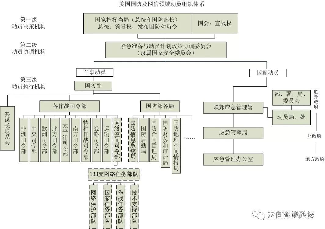 在军事动员和国家动员两方面,美国都建立了网信方面的领导机构。其中,在军事方面,2009年美国创建网络空间司令部,整合统一管理三军网络空间防御资源,加速改进保密信息的互通能力、共享能力和对网络空间攻击的快速反应能力。通过机制改革,为网信动员顺利运行做好准备。2017 年,网络空间司令部升格为联合作战司令部的重要组成部分,与其他九大联合作战司令部并驾齐驱。近期公布的一项主要防御政策法案中,还把国防信息系统局(DISA)大部分网络防卫责任转交给网络空间司令部。