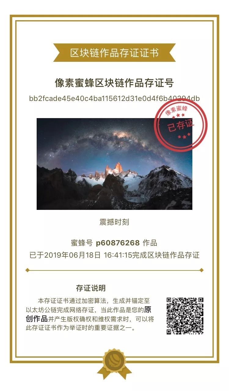 每次发布作品后,在每幅作品旁有个“小勋章”,点击之后会看到这样一张“区块链作品存证证书”(如下图)。