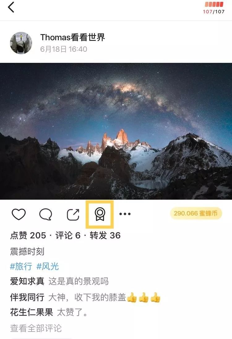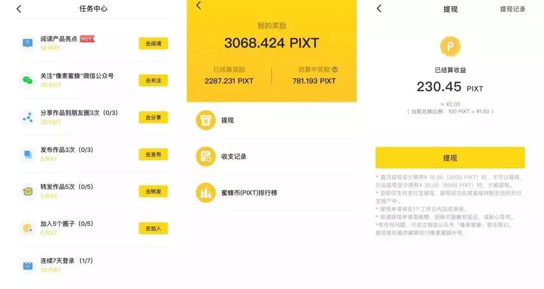 创作者上传原创作品,受到其他用户关注后即可获得像素蜜蜂平台积分PIXT(蜜蜂币);而其他用户则可通过转发、评论点赞、作品点赞等行为来赚取PIXT。这背后还有一条隐形规则是,用户积累粉丝越多,收到或发出的每个评论或点赞的对应币值越大。