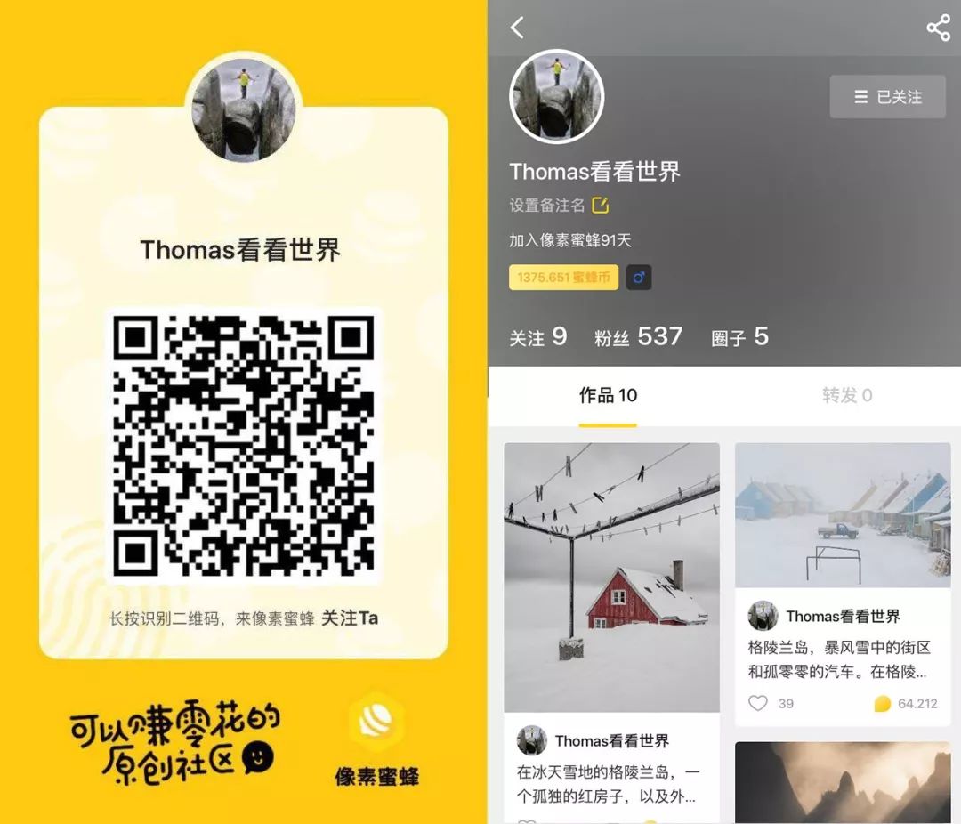 这就是我最近也在用的一款摄影社区了。下图是我在像素蜜蜂的账号,感兴趣的同学可以过来找我。