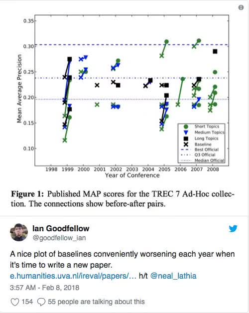 通常,至少有一个 baseline 应该是另一篇论文发表的结果,因为其他论文的作者有动机来获得好的结果。 这样评估至少是动机相容的(incentive-compatible)。