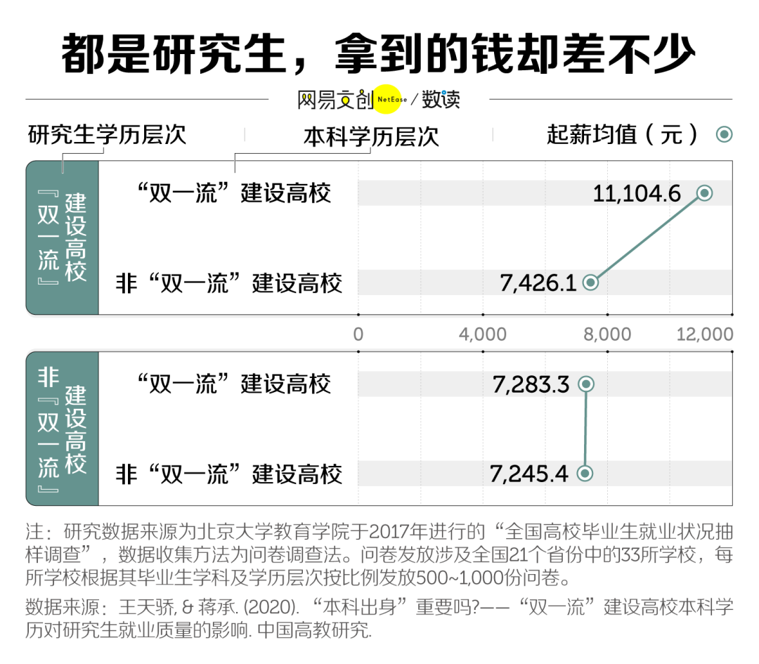 北京大学某课题组的一项研究表明,研究生同为双一流高校,本科学历为双一流的学生平均起薪为 11104.6 元,本科为非双一流的仅有 7426.1 元,比前者将近低 3700 元。并且,起薪差异中有 52.9% 正是学历筛选歧视所造成的 [5]。