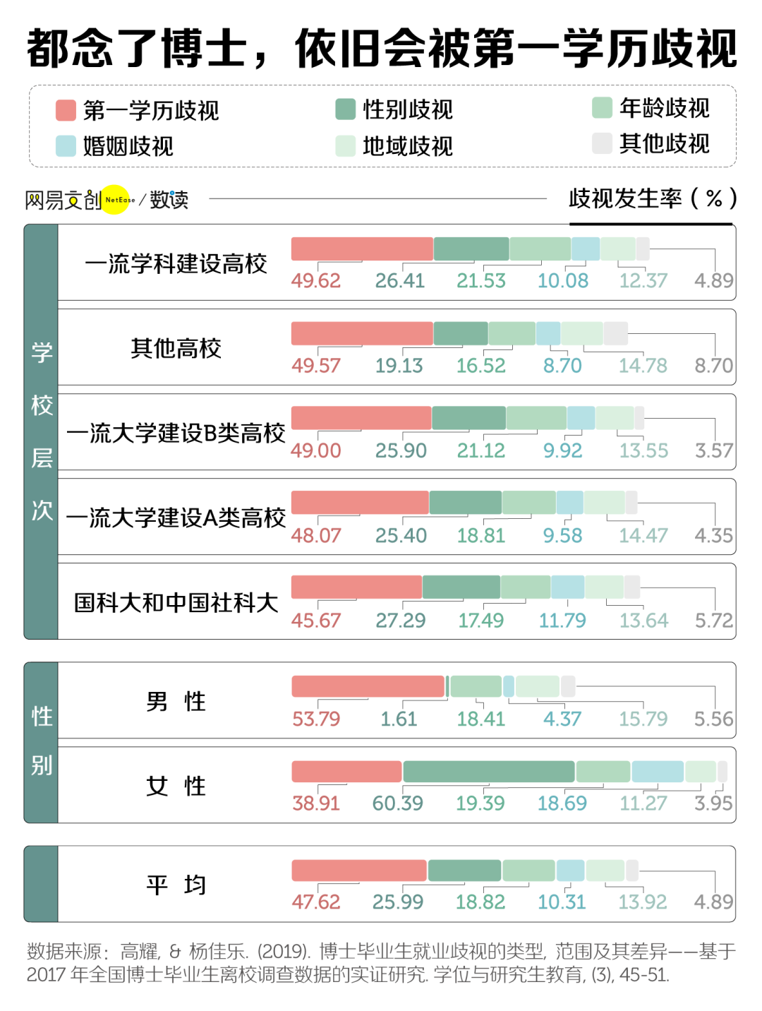 另外,男女博士遇到的歧视也存在差异。女博士更容易遭遇性别歧视,男博士更受第一学历的困扰。