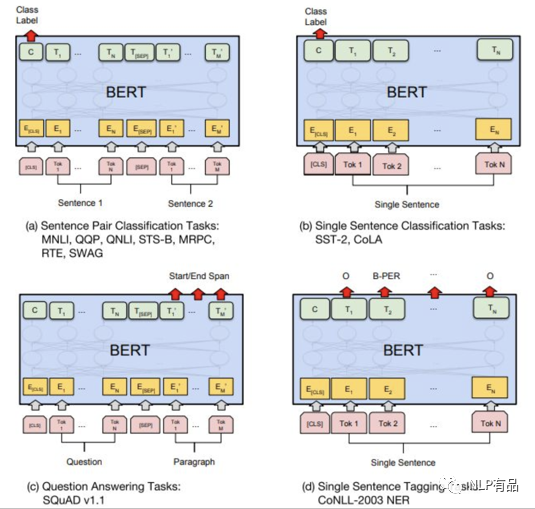 可以将Bert看做一个文本编码器,可以应用在各类NLP上下游任务网络构建中作为文本嵌入层使用。如上图(a)文本匹配任务;(b)文本分类任务;(c)抽取式问答任务;(d)序列标注任务。其中Bert微调的具体用法: