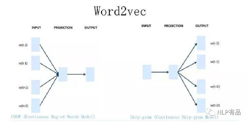 Word2Vec 有两种训练方法:用语言模型 CBOW 和 Skip-gram。1)CBOW的核心思想是从一个句子里面把一个词抠掉,用这个词的上文和下文去预测被抠掉的这个词;2)Skip-gram和 CBOW 正好反过来,输入某个单词,要求网络预测它的上下文单词。