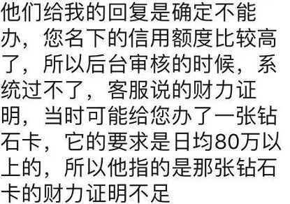 小红:我是系统退件,理财经理一会说可能是因为逾期(然而我没有)、一会说是负债和贷款超过了60万(我也没有),一会说是钻石卡的要求改成80万了,总之就是不批。
