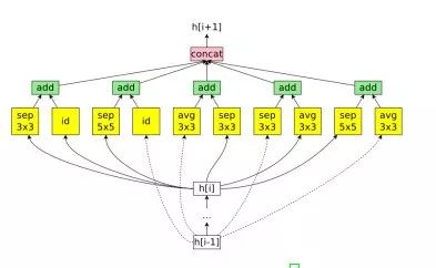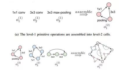 为了找到合适的网络架构,除了传统的串行网络,还有基于cell来做层级化网络架构搜索的。下图展示的是先从几个最基本的操作,搜索得出一个一级的网络组件,之后在自动化的搜索如何用一级组件搭建网络。