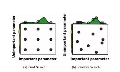 模型选定后的调参过程,最常用的是网格搜索,也就是按照固定的间距,在搜索空间上打点,但下图指出,网格搜索不一定好过随机搜索,原因是对于重要参数,网格搜索采样的点会不足,从而导致无法取到对模型效果相对较好的点,autoML会使用随机抽样,首先评价各个超参数的重要性,之后再对重要的参数进行微调。