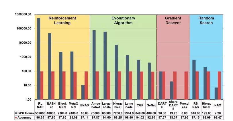 NAS算法作为当前AutoML最热的研究领域,有很多变种,下图展示了在CIFAR1000上,不同NAS方法的效果及训练用时。相比于强化学习和进化算法,传统方法的用时更少。