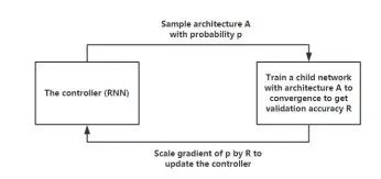 这里的行为是以一定的概率选择某个网络结构,行为是在该结构下,训练子网络,使其在训练集上达到预设的准确率,奖励是该子网络在测试数据集上的准确率与该网络被选择的概率的乘积,通过将子模型的泛化能力作为反馈,用于控制不同模型被选择概率的RNN得以优化其梯度,以选出泛化能力最强的模型,同时通过始终保持一定概率选择其他模型,处理explore VS exploit的权衡。