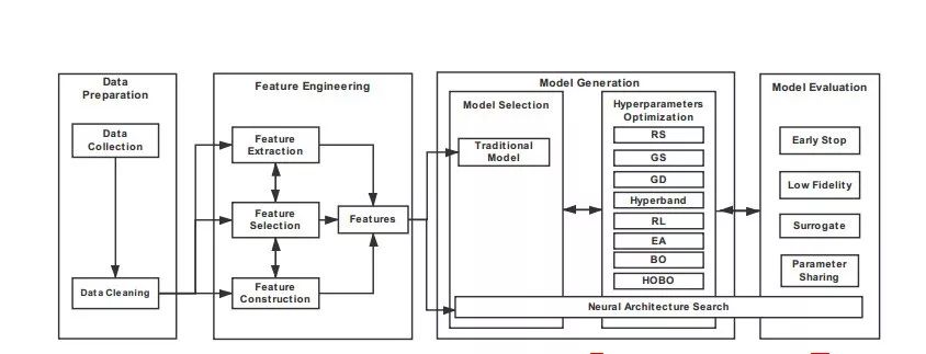 从流程先后顺序来分,最初是数据准备,包括数据收集和清洗,之后是特征工程,其中包括特征选择(决定哪些特征需要保留),特征提取(对特征进行降维,常用的方法例如PCA),特征组合(将多个特征合并/构建为一个新的特征);在之后的模型构建中,最关键的是模型选择,之后超参数优化,可以采取很多方式,最简单的做法是网格搜索,常用的方法包括用强化学习,进化算法,贝叶斯优化,以及梯度下降,来缩小搜索空间;最后,AutoML通过引入提前停止,降低模型的精度,参数共享来自动化模型评价的过程。