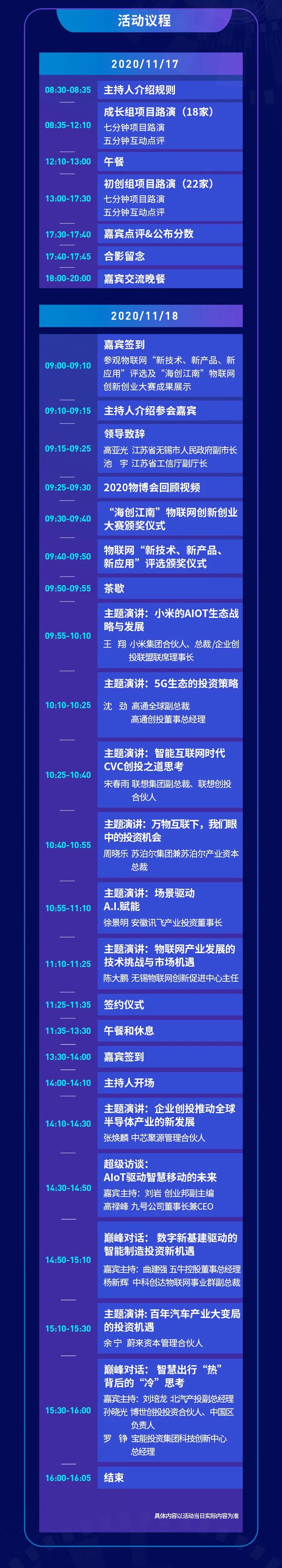 大会邀请到了20余位业界大咖,分享技术创新、生态战略、人工智能、物联网、AI+5G智能互联等内容。同时,现场还将进行2020世界物联网博览会新技术新产品新应用成果评选活动及“海创江南”物联网创新创业大赛颁奖仪式。