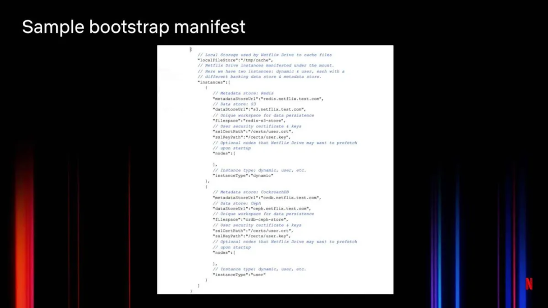 在启动过程中,Netflix Drive 通常要求指定一个挂载点。它使用用户的身份进行认证和授权。它创建本地存储的位置(文件将被缓存在那里),以及端点的云元数据存储和数据存储。清单包含用于预加载内容的可选字段。