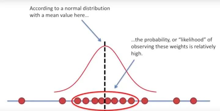 对于这个正态分布,我们可以计算每个点出现的概率: 。其中 和 是这个正态分布的均值和方差, 是第 条数据,我们把每条数据出现的概率相乘,得到了“在这套正态分布的均值方差下,我们观测到这批数据的概率”。