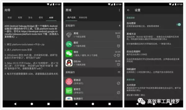 当你退出一个App,它就会将App 进入待机状态,待机超时之后,黑域会强行停止App。