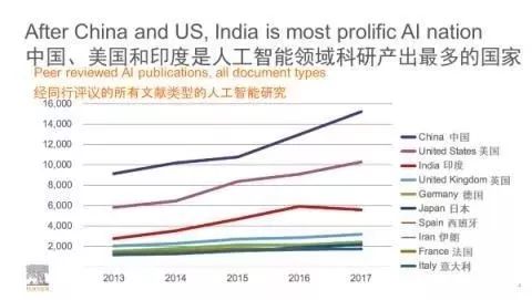 这份名为《人工智能:知识的创造、转移与应用》的报告称:2017年,中国在人工智能领域出版的文章数量位列全球第一,科研产出已在2004年超过美国,如果保持当前的势头,中国有望在四年内赶超欧洲。