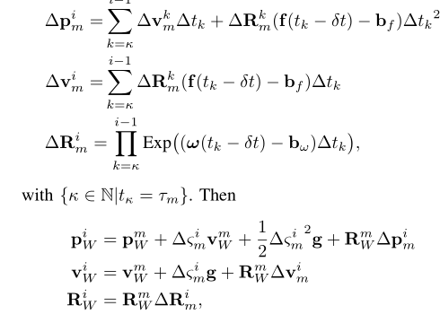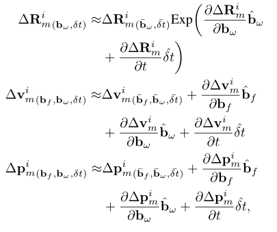在任何优化之前,假设完全了解偏差和时移,预处理预积分项。这个假设一般不成立。为了解决这个问题,我们采用了一阶扩展,作为我们方法的偏差校正。