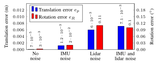 图2 不同雷达噪声下的标定精度。在这些实验中,惯导数据仿真为没有噪声。