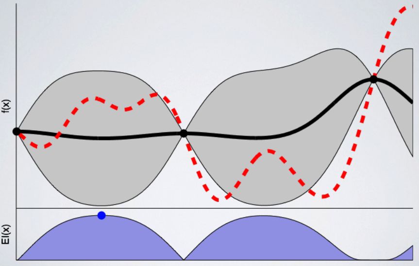 我们可以将高斯过程定义为学习从超参数配置到度量映射的替代过程。它不仅产生一个预测值,而且还会给我们一个不确定性的范围。